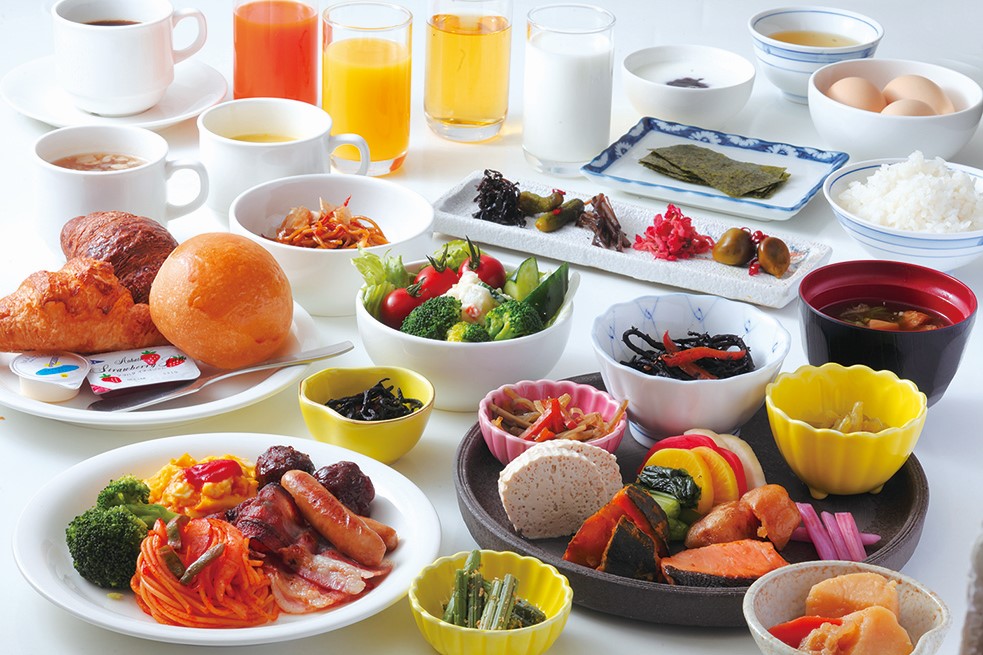 ◎朝食は、焼き立てパンと地元の食材を生かした、和洋のメニューを組み合わせたバイキング形式。季節ごとに内容が変わる期間限フェアも好評。